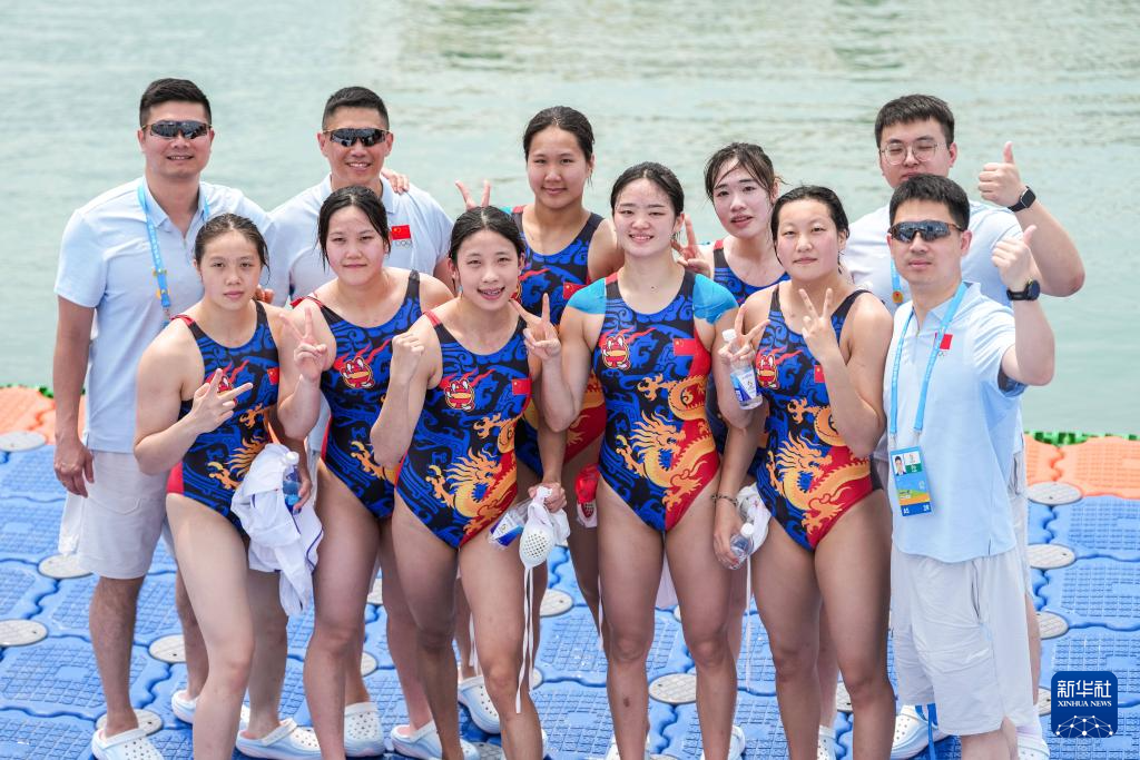 4月22日,中国队守门员严欣彤(后左二)与队友庆祝赢得比赛。