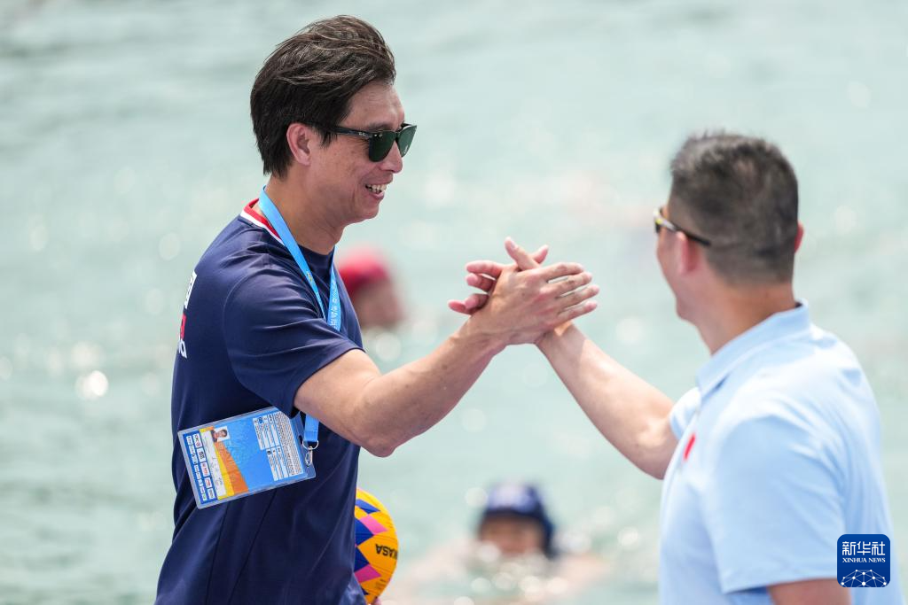 4月22日,中国香港队教练赵锦文(左)与中国队教练握手。