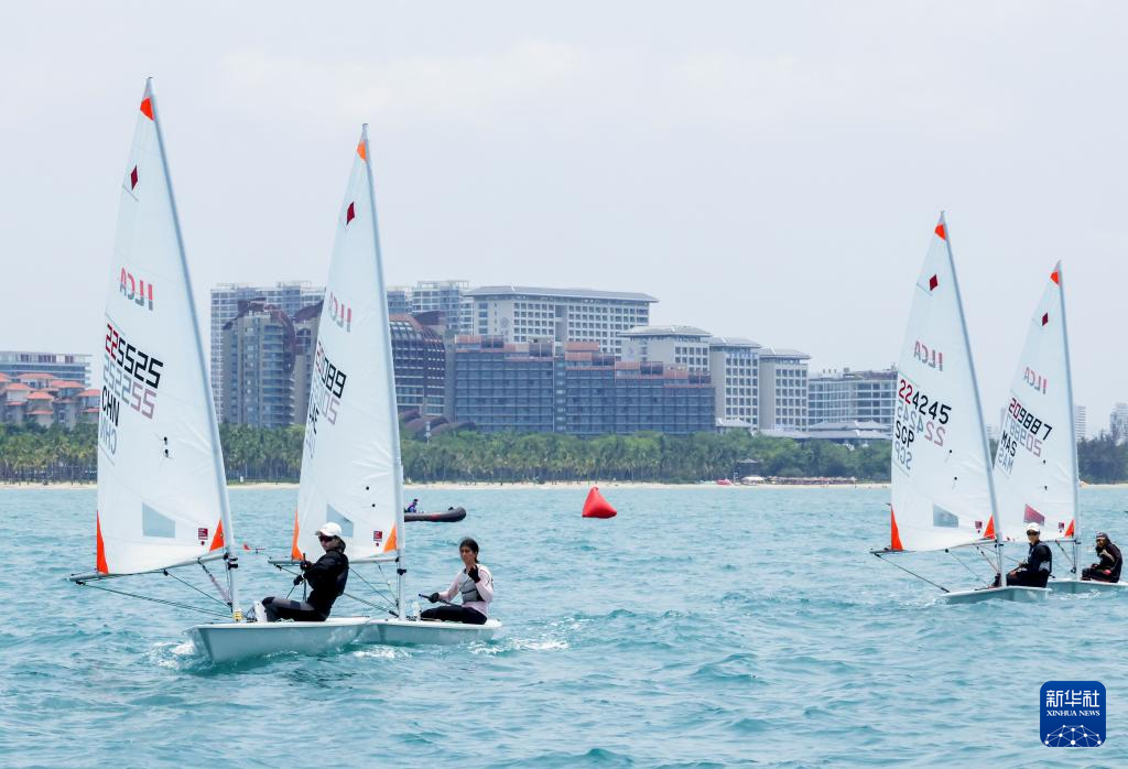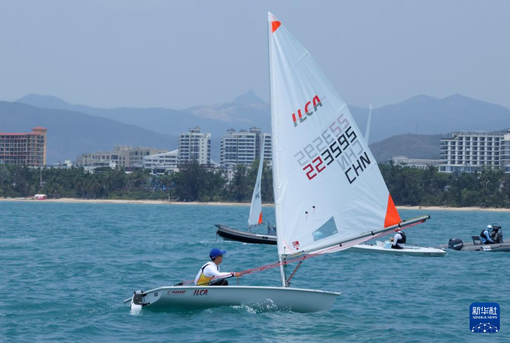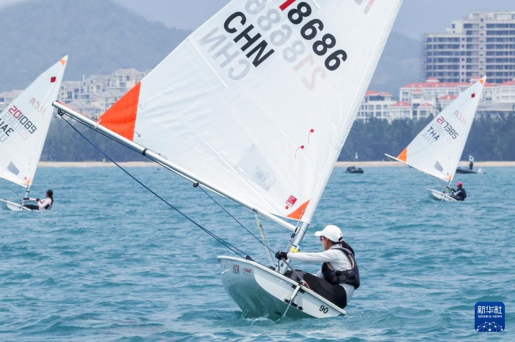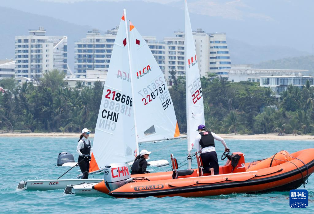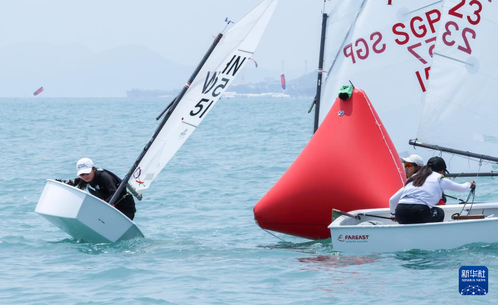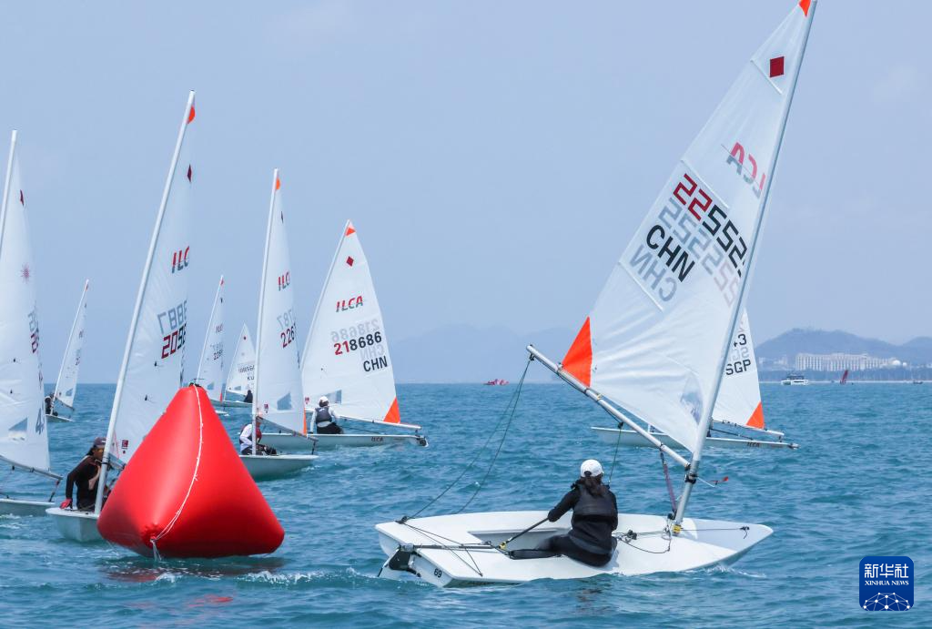 4月23日,中国选手颜果果(左一)在ILCA4帆船女子第1轮比赛中。