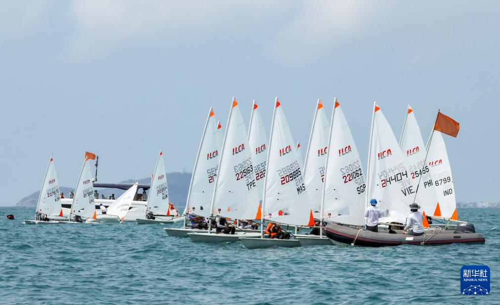 4月23日,选手们在ILCA4帆船男子第1轮比赛中出发。