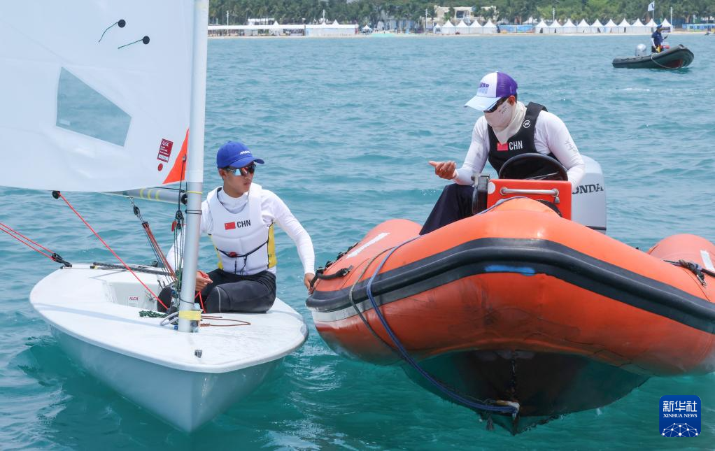 4月23日,中国选手王雅格(左)和颜果果(中)在ILCA4帆船女子第1轮比赛后与教练交流。