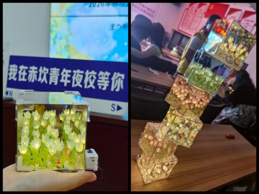 当全体青年一同点亮手中的花朵小夜灯,暖黄柔和的灯光缓缓绽放,一朵朵精致的花朵在光影中格外动人。