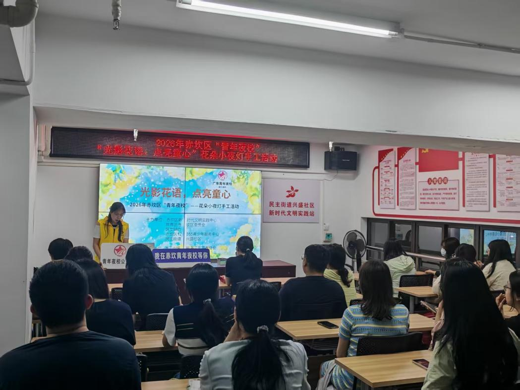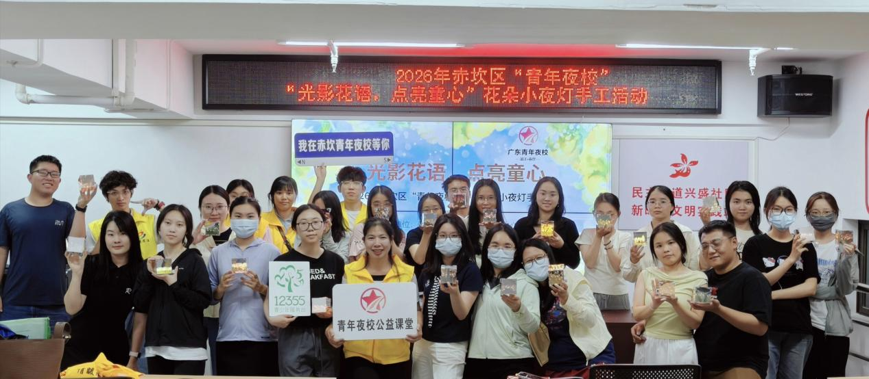 为积极响应青年文化发展号召,丰富赤坎青年课余文化生活,激发青年艺术创造力与动手实践能力,2026年4月21日晚,由赤坎区新时代文明实践中心、共青团赤坎区委员会、赤坎区文明办、赤坎区12355青少年服务中心、民主街道兴盛社区主办,湛江市情暖湛江志愿者协会承办的2026年赤坎区“青年夜校”——“光影花语,点亮童心”花朵小夜灯手工活动,在兴盛社区新时代文明实践站温情启幕。二十多名青年相聚于此,在指尖创作中释放压力,在光影流转中收获美好,沉浸式感受手工艺术带来的治愈与温暖。