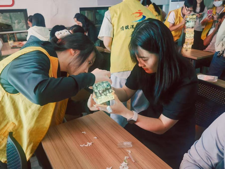 志愿者们穿梭在人群中,及时为大家答疑解惑、提供帮助。大家一边创作一边轻声交流心得,互相分享创作小技巧,原本陌生的青年们在互动中渐渐熟络。