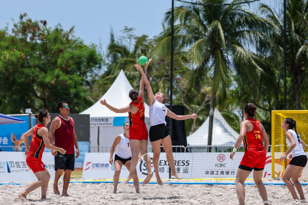 4月26日,双方球员在比赛中。当日,在海南三亚举行的第六届亚洲沙滩运动会沙滩手球女子小组赛中,中国队2:0战胜土库曼斯坦队。新华社记者 李博 摄