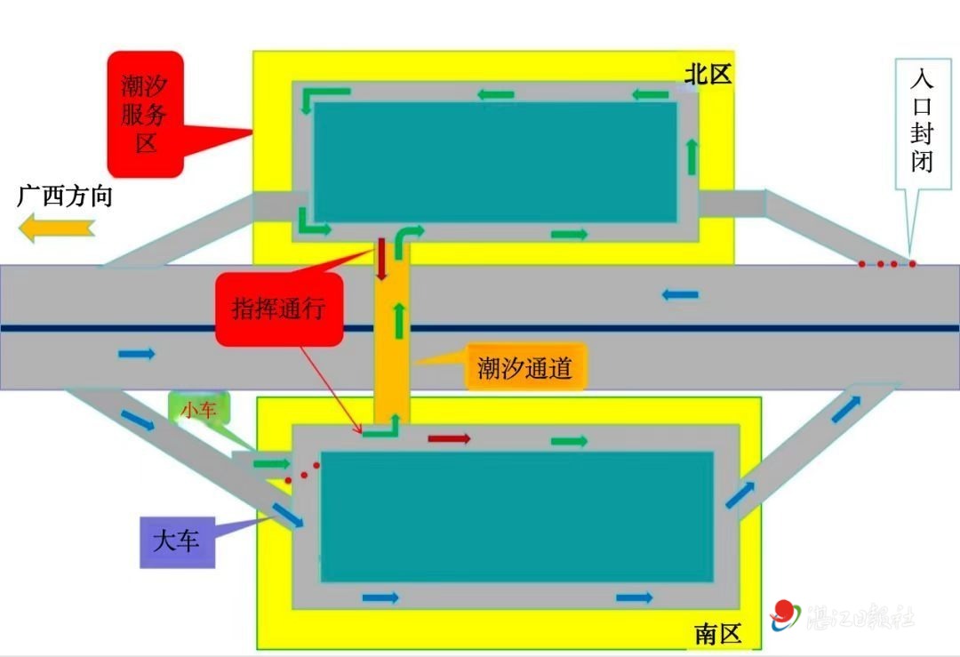 湛江交管部门温馨提示:潮汐通道仅限小型客车,大车请错峰或选择相邻服务区;进入服务区请按标识行驶、服从现场指挥,不穿插、不占道;假期车流较大,建议错峰补给、轻装简行,平安畅通出行。