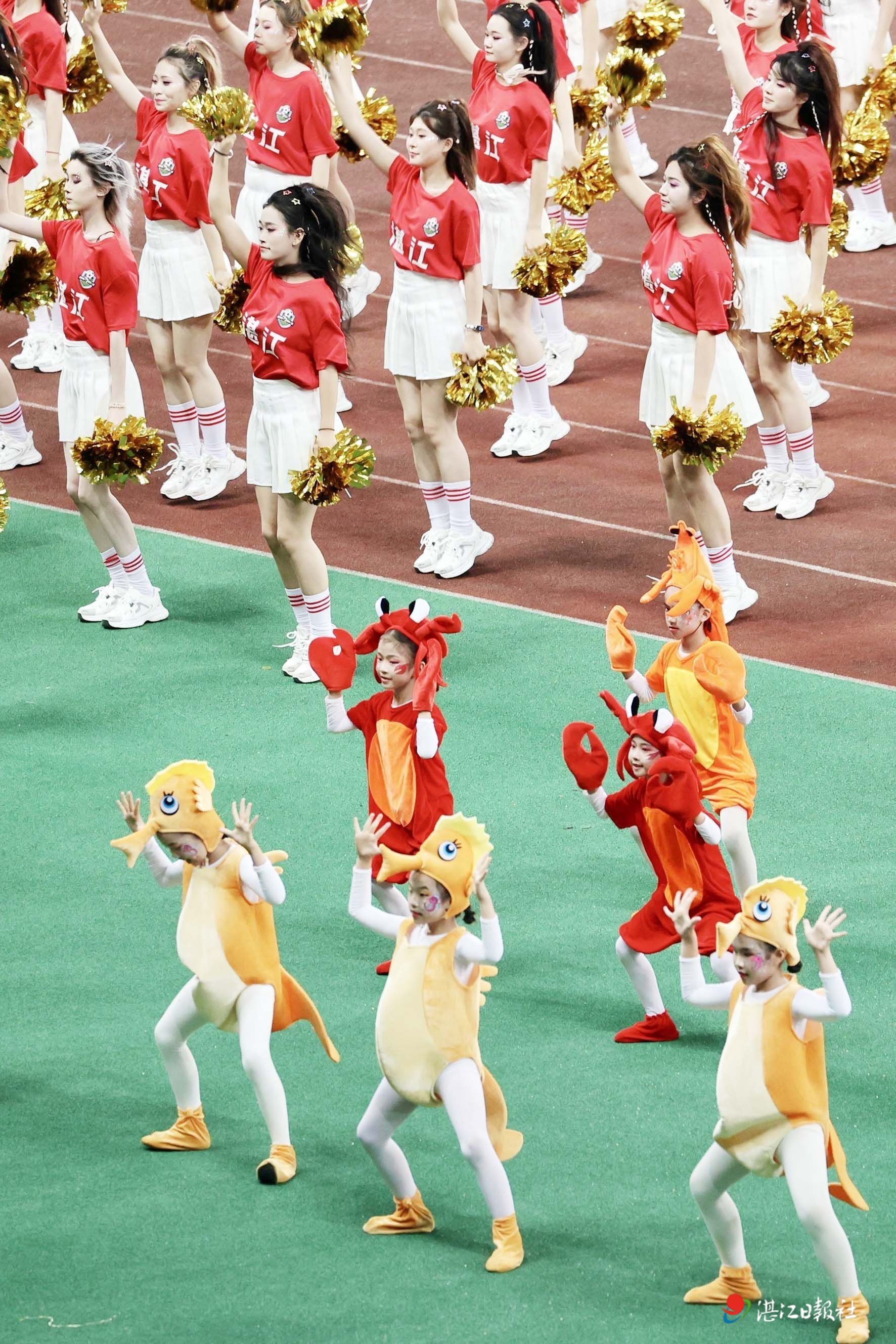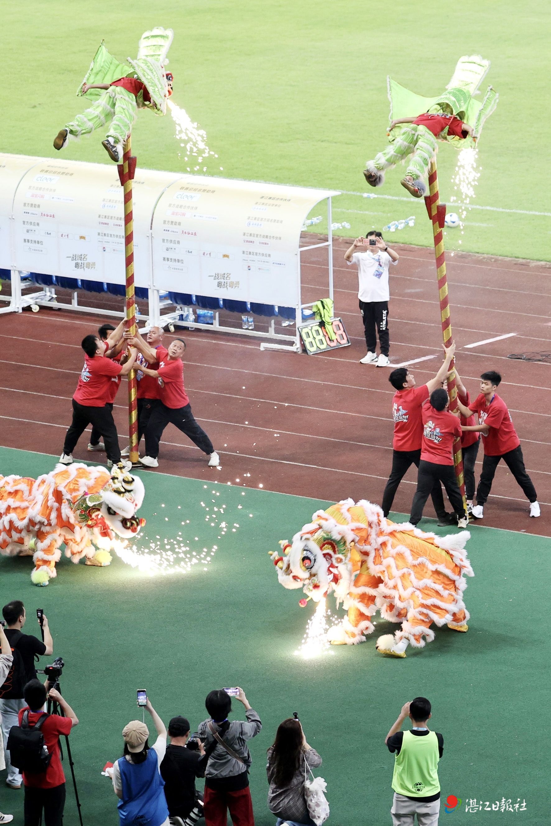 现场,两队还举行了温馨的互赠礼物仪式。我市送给客队的是海虾和火山红薯,佛山队还以甘竹罐头,简单的互动仪式尽显兄弟城市的情谊。赛场中央,精彩的湛江非遗民俗串烧表演火热上演,集中展现岭南地域文化魅力。活力醒狮、传统舞鹰雄、民俗网龙轮番登场,技艺精湛、气势磅礴,传统民俗文化震撼亮相;与此同时,大湾鸡、海滨公仔、海鲜主题趣味人偶同步亮相,趣味造型灵动可爱,丰富的民俗展演融合地域特色,为现场观众带来耳目一新的文化盛宴。