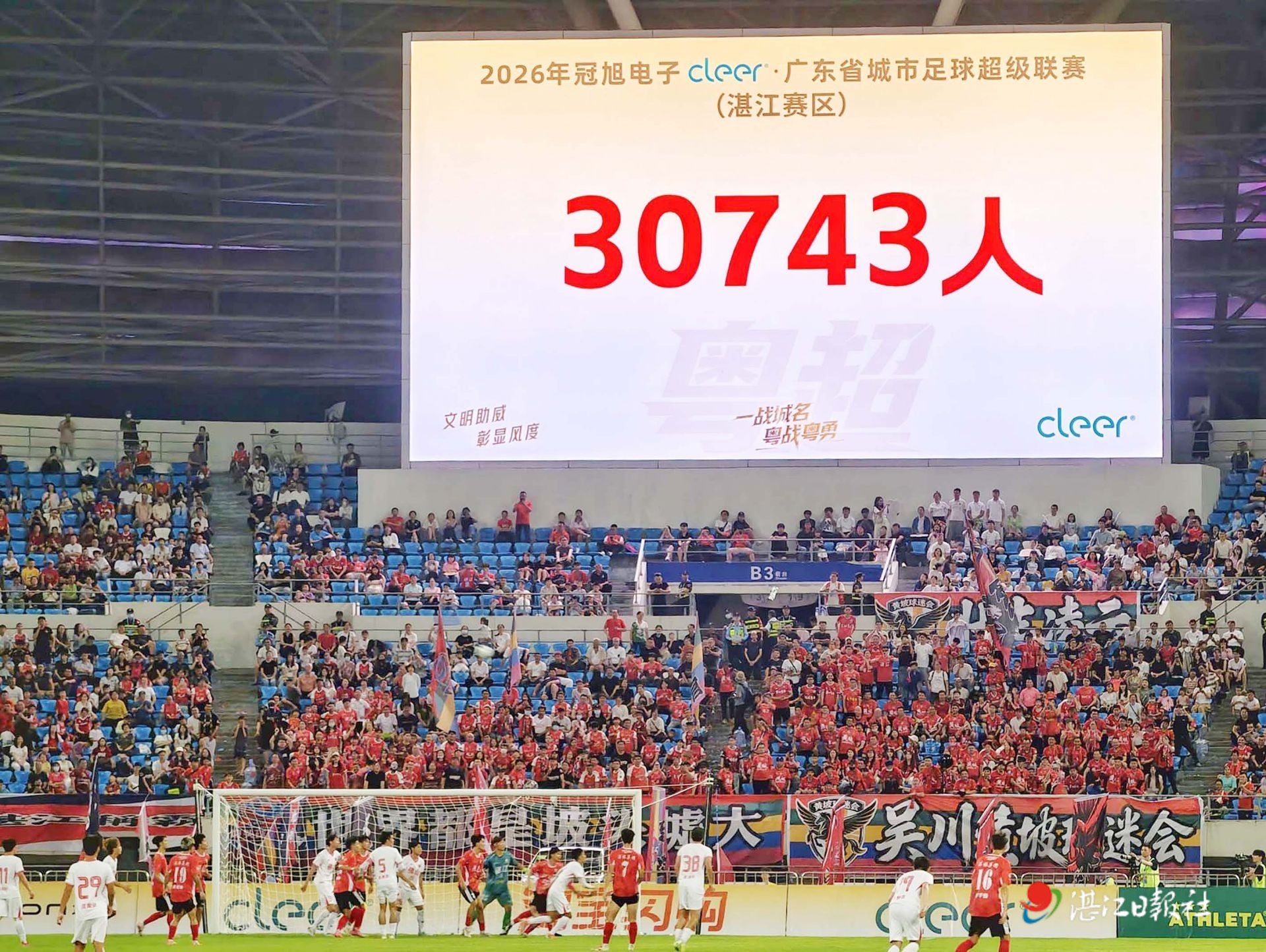 4月26日晚,在三万多名观众热情助威下,2026年广东省城市足球超级联赛(粤超)首轮焦点大战在湛江奥体中心体育场精彩上演。湛江队和佛山队鏖战九十分钟,最终以0:0握平。