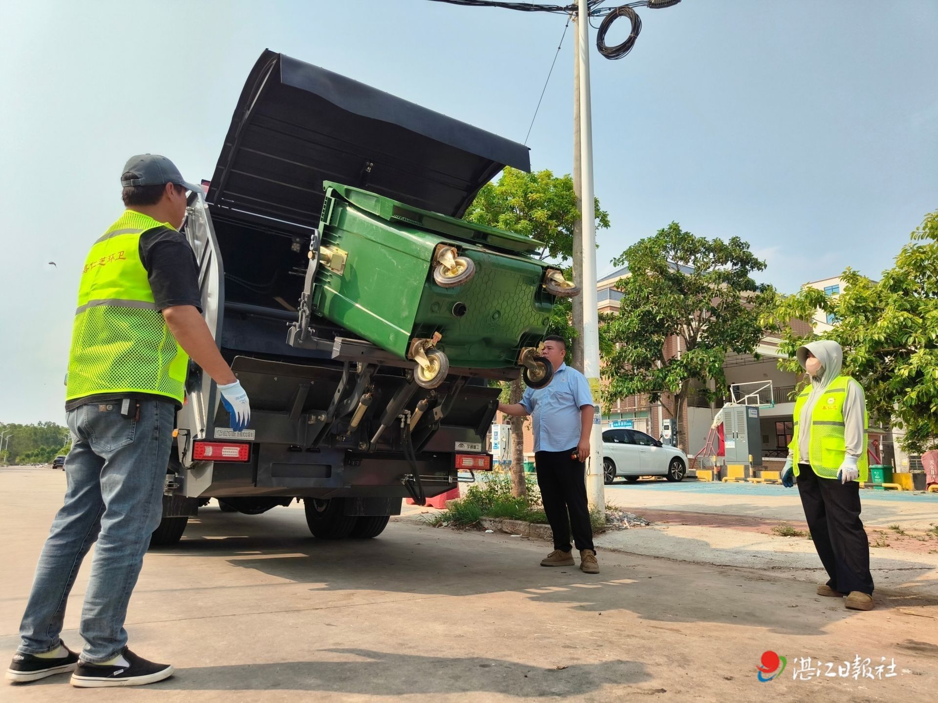 每天清晨6时,吴川市塘㙍镇流山垌村的村道上传来垃圾清运车的轰鸣声。司机熟练地将挂桶式压缩车停靠在路旁,机械臂稳稳抓起一个660升超大容量密闭垃圾桶,倾倒、复位、驶离,整个过程不过两分钟。