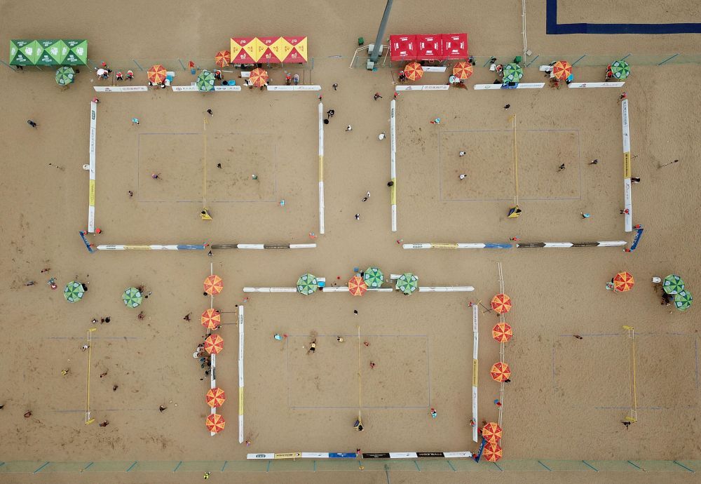2018年7月19日,2018国际排联世界沙滩排球巡回赛海阳公开赛在山东海阳进行(无人机拍摄)。新华社记者 朱峥 摄