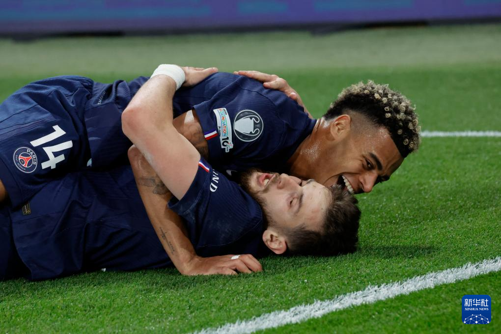 4月28日,巴黎圣日耳曼队球员克瓦拉茨赫利亚(下)在进球后与队友杜埃庆祝。