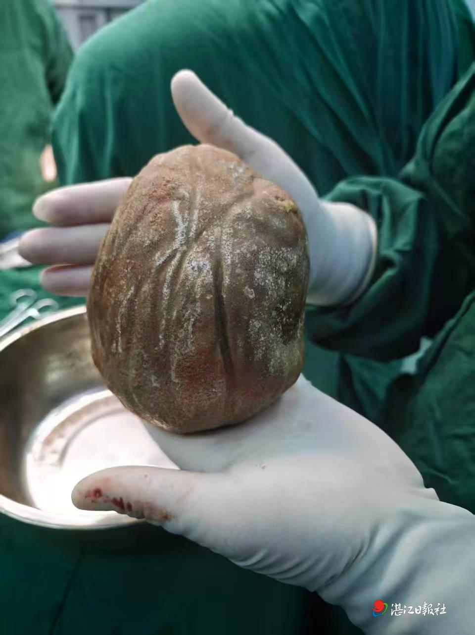 据广东医附院徐闻医院泌尿外科副主任医师林渊介绍,这枚巨型膀胱结石横径10厘米、长径13厘米、重达1.3公斤,尺寸堪比成人两拳大小,几乎占据患者整个膀胱。
