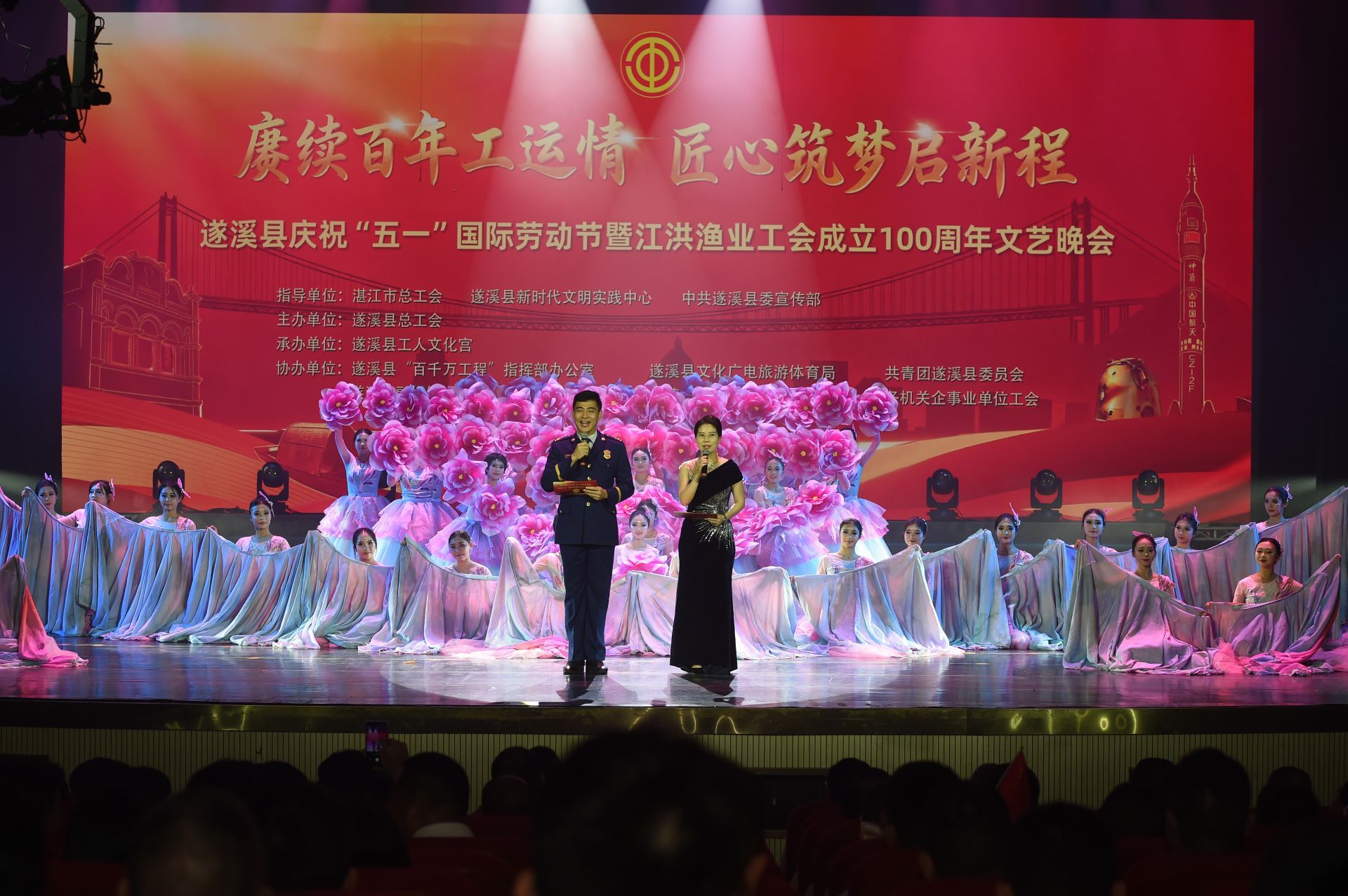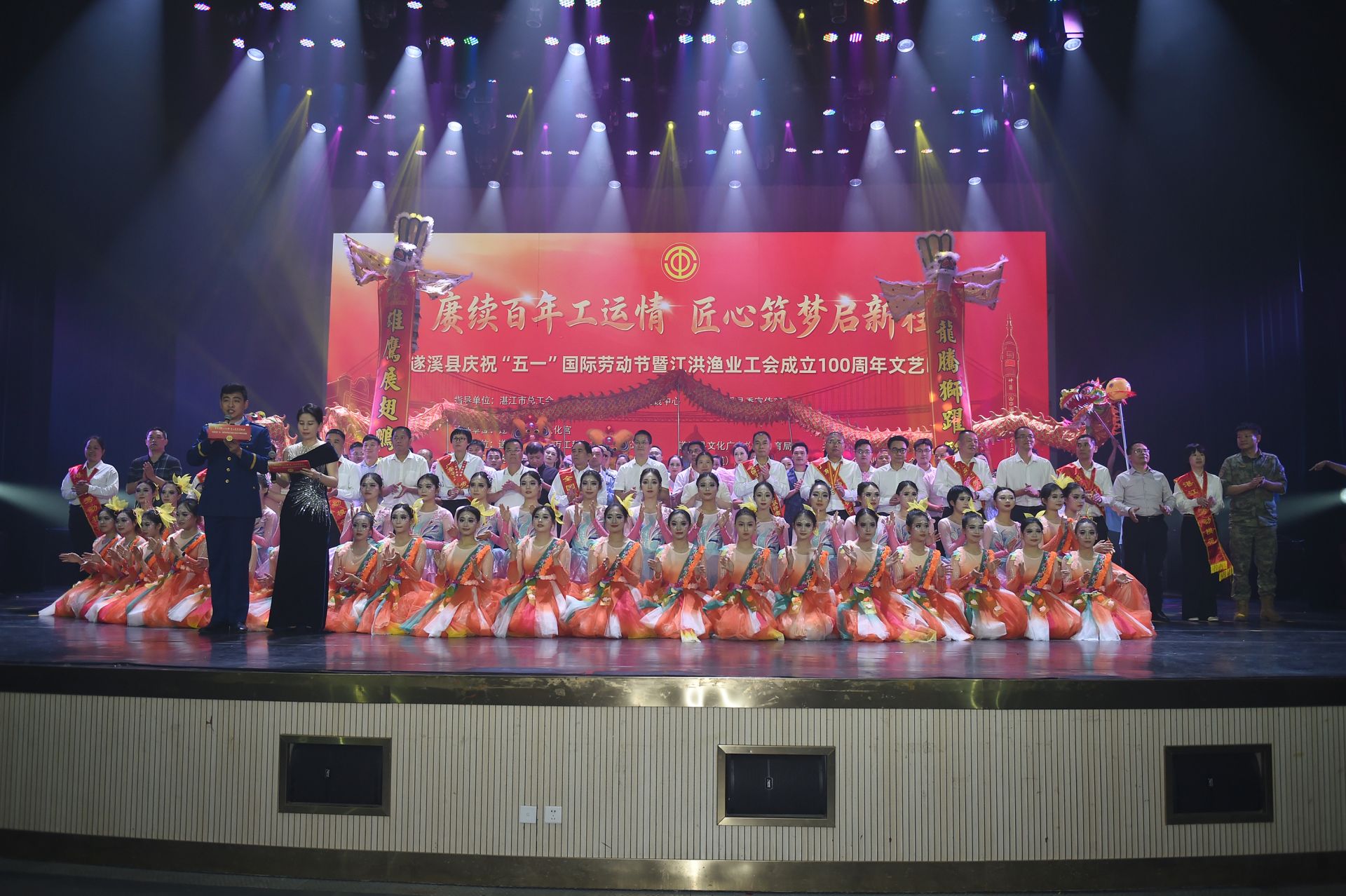 2026年4月29日晚,“赓续百年工运情 匠心筑梦启新程”遂溪县庆祝“五一”国际劳动节暨江洪渔业工会成立100周年文艺晚会在遂溪县影剧院精彩上演。整场晚会灯光璀璨、掌声不息,全县各行各业劳动者代表齐聚一堂,共庆劳动佳节、共忆百年工运、共话发展新篇。