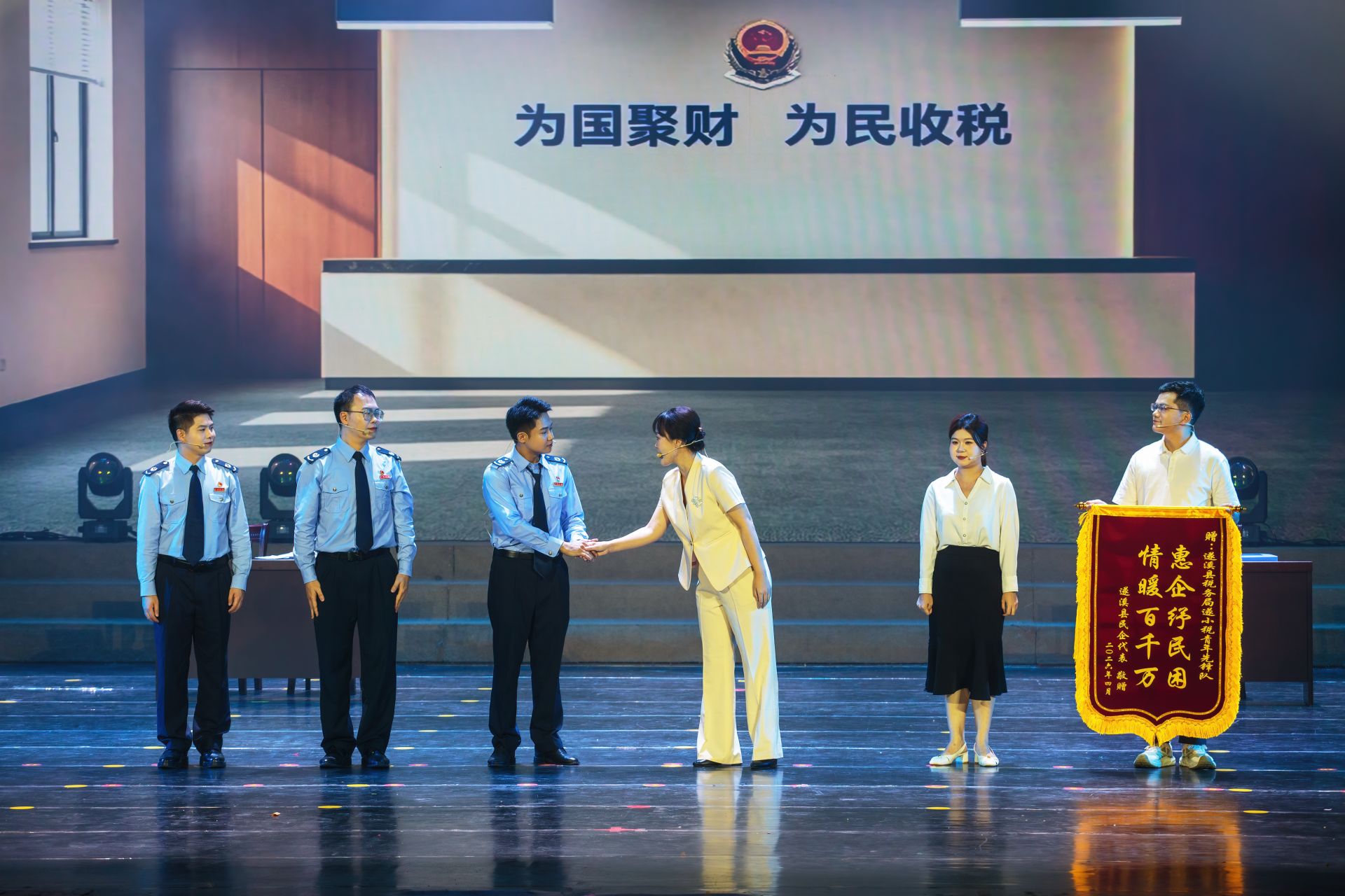 演讲情景剧《税助万企 共惠发展》聚焦惠民助企政策,生动展现各部门联动助力“百千万工程”、赋能企业发展的责任担当。歌曲《爱笑的你最美》、歌伴舞《多彩遂溪 幸福家园》聚焦全国文明城市创建工作,呼吁全民携手共建美好家园,共享劳动成果与幸福生活。