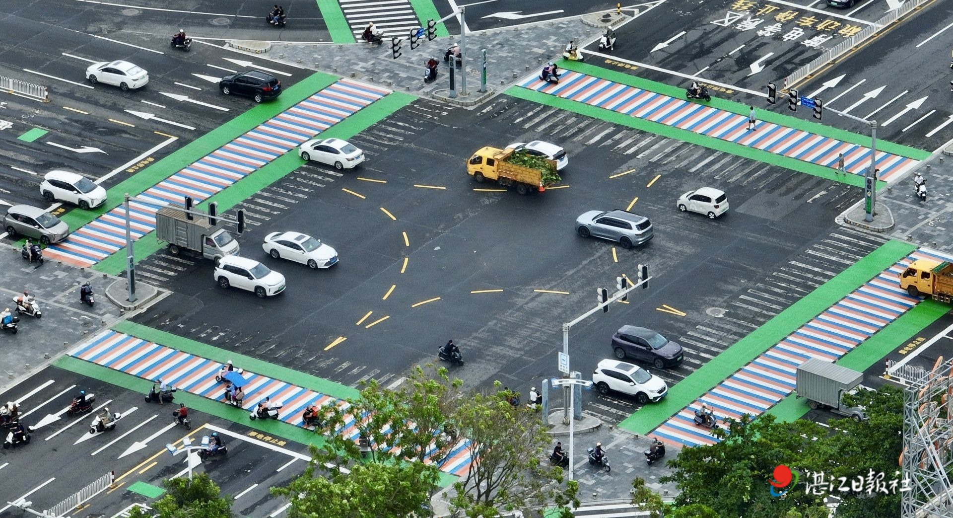 改造后的斑马线采用醒目的橙蓝白条纹设计,色彩明快、辨识度高,有效提醒机动车驾驶人提前减速礼让行人;绿色的非机动车道区域与斑马线无缝衔接,清晰划分了行人、非机动车与机动车的通行空间。