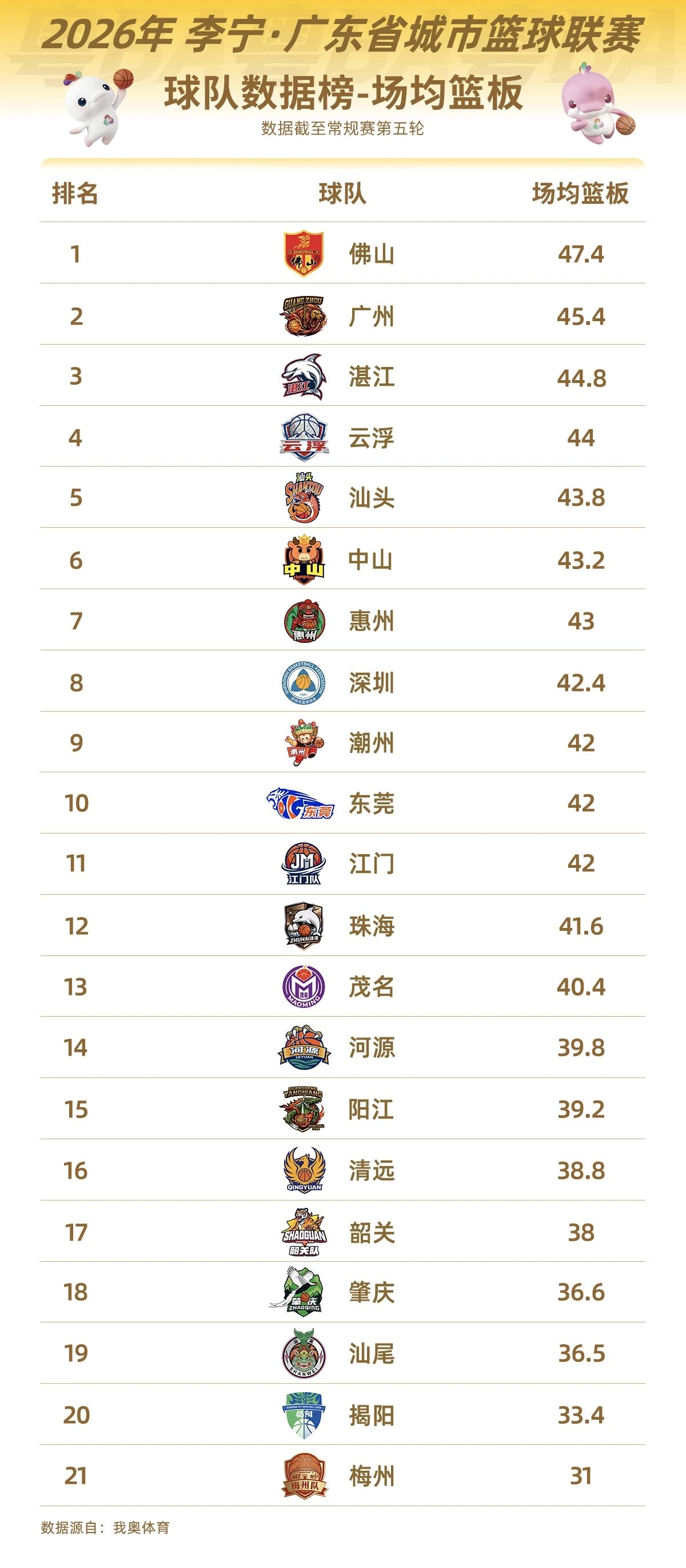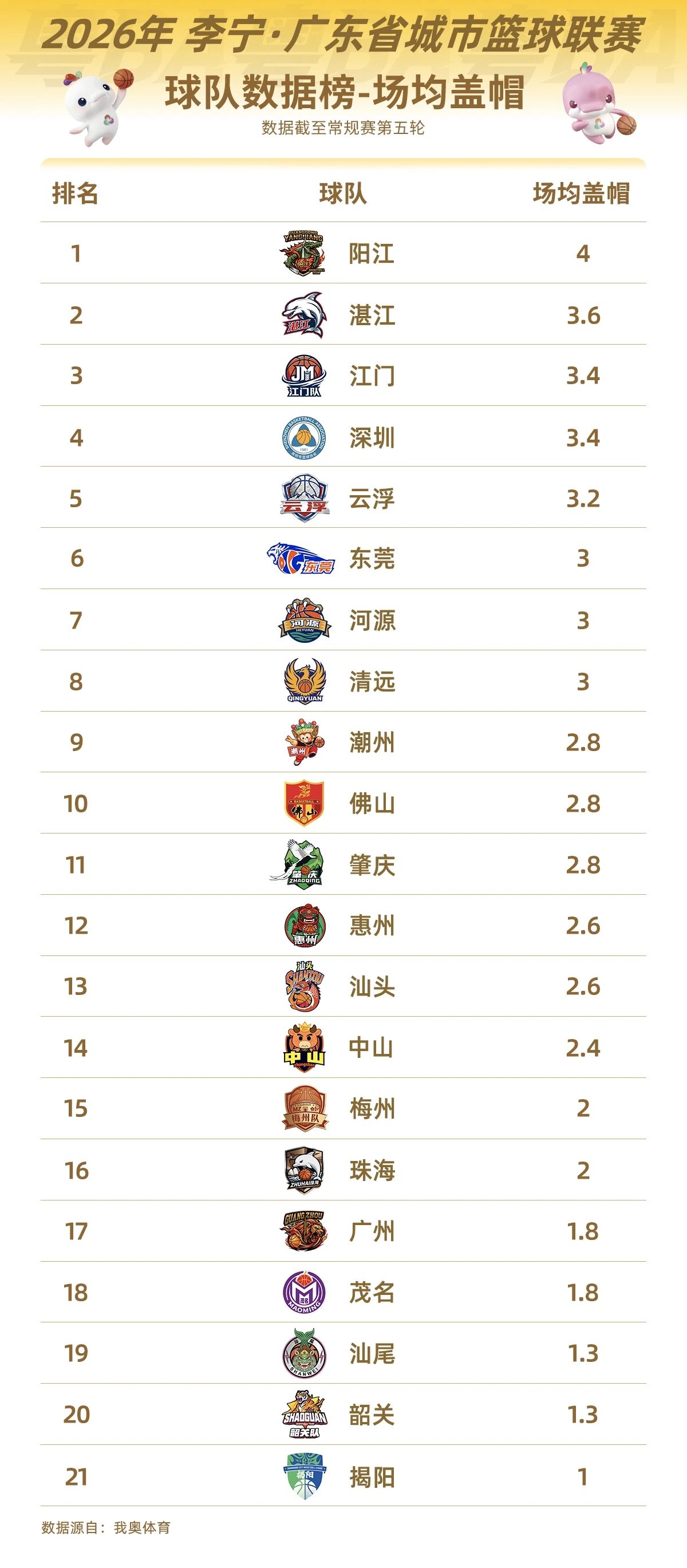 4月29日,广东省篮球协会发布了2026年李宁·广东省城市篮球联赛(粤BA)常规赛前五轮全省21支球队的场均数据排行榜。其中,湛江队在场均盖帽榜上高居全省第二位,在场均篮板榜上排全省第三位。