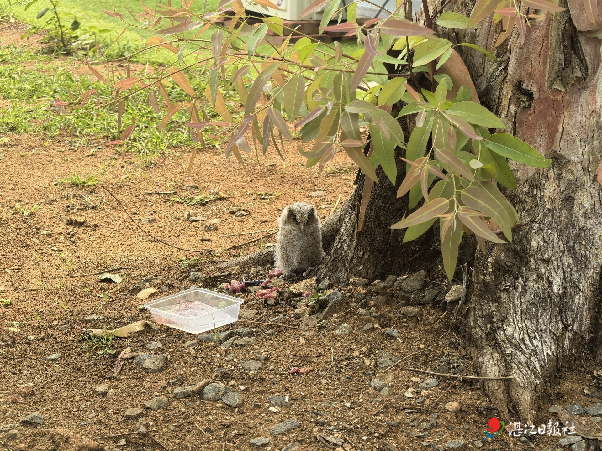 4月19日,一只猫头鹰幼鸟意外坠落在湛江海警局徐闻第二工作站,执法员发现时,幼鸟状态十分虚弱,无法自主飞行,疑似从高处巢穴坠落。执法员立即将其小心转移至安全区域,避免幼鸟受到惊吓和二次伤害,并贴心准备了清水与食物。