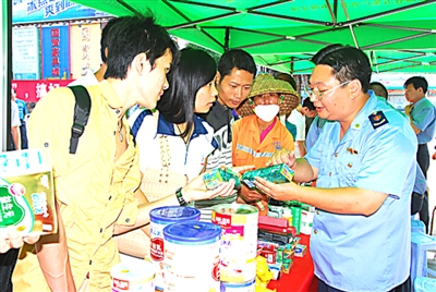 昨日,徐闻县在文化广场举行“三打”宣传城镇广场活动,现场展示收缴的假冒伪劣物品,为市民讲解如何辨别真假物品(如图,记者简陈明 通讯员王策铭摄)。