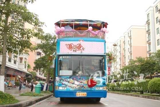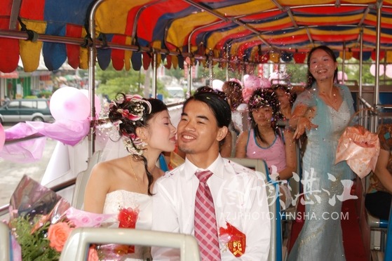 2006年6月,装扮一新的旅游大巴从霞山使出,沿人民大道来到赤坎金沙湾接新娘子;然后,大巴驶往赤坎中山路、跃进路最繁华的地段,最后回到新郎的老家东海岛民安镇丹雾村,在家乡举办一场简单而又特别的婚礼。