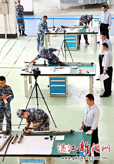 舰炮专业更换输弹机钢丝绳。