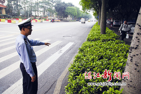 在湛师门口,记者和谢中队长看到一条斑马线正对绿化带,学生只能穿过绿化带,实在不合理。此外,下坡路段的车辆速度飞快,对学生的出行安全造成威胁。谢中队长说,的确应当移除斑马线正对的绿化带,方便学生通行。届时将联合市城市综合管理局进行处理。
