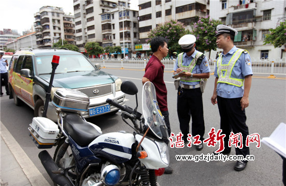 “一辆绿色的士冲红灯开往霞山方向……”昨日上午10时40分左右,在人民大道中伏击的执法人员,听到了对讲机传来俱乐部岗亭民警的报告。随后两名执法人员在距离俱乐部红绿灯约300米处把这辆违章车辆拦截下来。执法人员对其进行耐心的讲解教育后,依法开出罚款200块、扣6分的罚单。