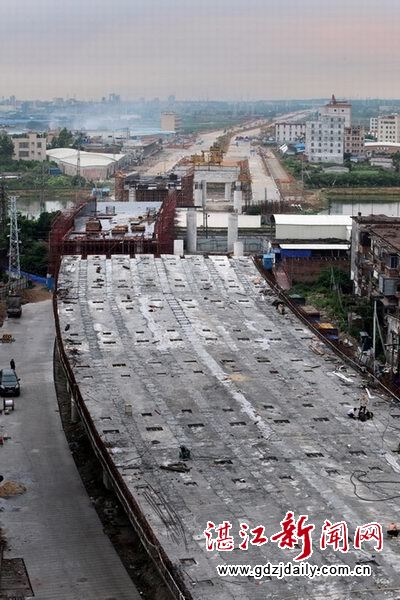 采访车驾向城市西面,在湛江海湾大桥连接线施工现场,伴随着隆隆的机械声,一条长达35米、重约125吨的小箱梁在架桥机的运送下缓缓放到盖梁上,随后焊接湿接缝、安装钢筋模板、进行小箱梁之间的浇筑,处处都是繁忙的施工景象。椹川大道至疏港公路(湖光快线)已于去年底建成通车,今年10月将全线建成通车。