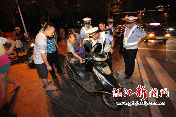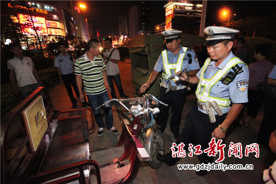 执勤民警在霞山区多个路段设点设卡清查违法车辆及违规行为。晚上7时54分,在人民大道南与解放东路的交汇口处,已经抓获5辆非法营运的改装三轮电动车。