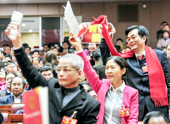 高举横幅、标语,挥舞围巾,组团“抢唛”……昨日上午,省政协十一届三次会议即席发言环节再次掀起“抢唛”大战,委员们为博得主持人眼球使出浑身解数,场面热烈。驻湛省政协委员、市人大常委会副主任刘忠芳身着鲜艳的粉红外套,连续10多次起立举手,最终成功“抢唛”(见上图,图据中新网),在发言中提出了对推进我省农村垃圾治理工作的建议。