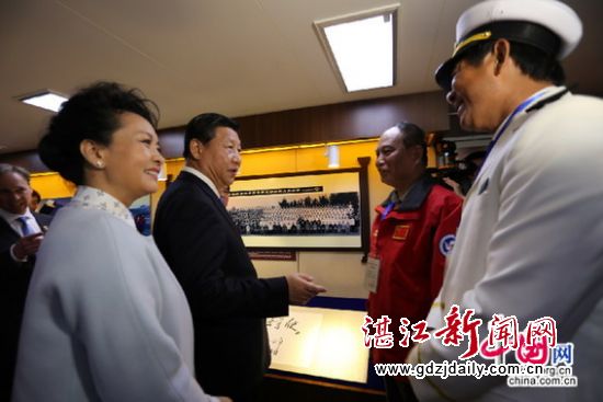 2014年11月18日,习近平主席及夫人登雪龙号科考船参观极地考察图片展,接见水手长,东海岛人吴林(图片来自中国网)