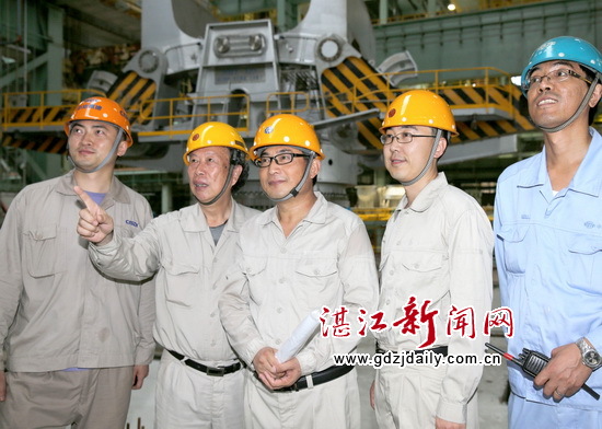 近日,郁祖达(左三)在钢铁基地察看建设进度。 本报记者 刘冀城 通讯员 王建国 摄