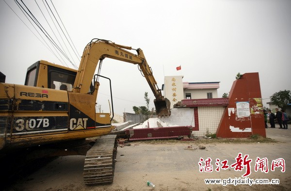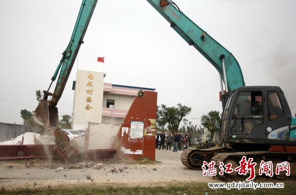 随着钩机的轰鸣,南三岛滨海旅游示范区南米村委会办公楼的大院围墙轰然倒下。为支持南三岛新农村建设,南米村委会带头拆除红线范围内的30多米围墙,为广大群众带了一个好头。
